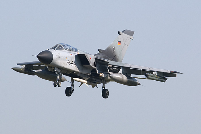 The airplane entered a long time in service with the Luftwaffe assault Panavia Tornados . It was still during the Cold War, and was designed primarily to attack ground targets while flying at low altitude at high speed. Thanks to the robustness and quality, these aircraft survived in many air forces today and has been successfully deployed in many conflicts. Tornado can accommodate two persons (pilot and weapon systems operator) and the specific variable geometry wings.